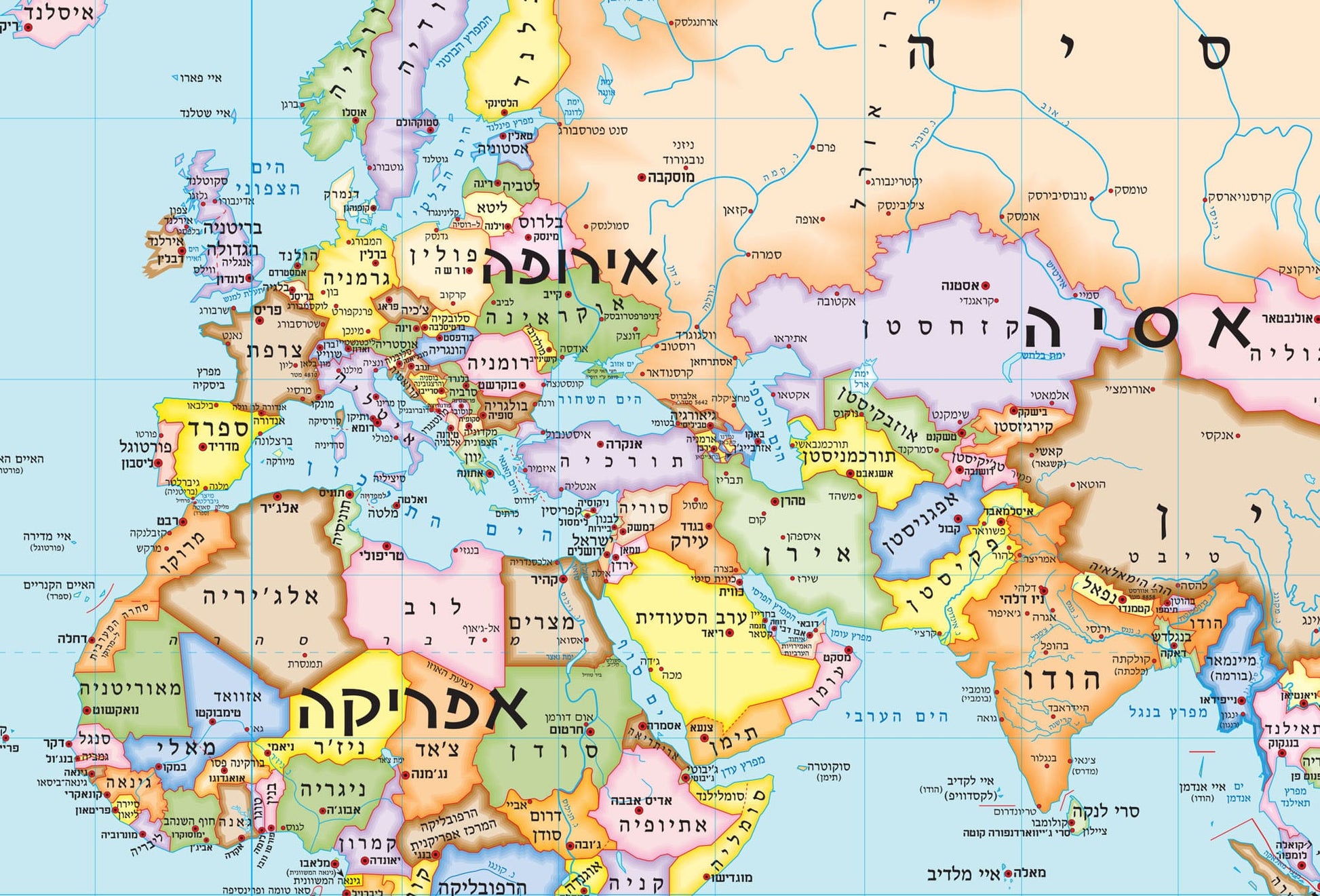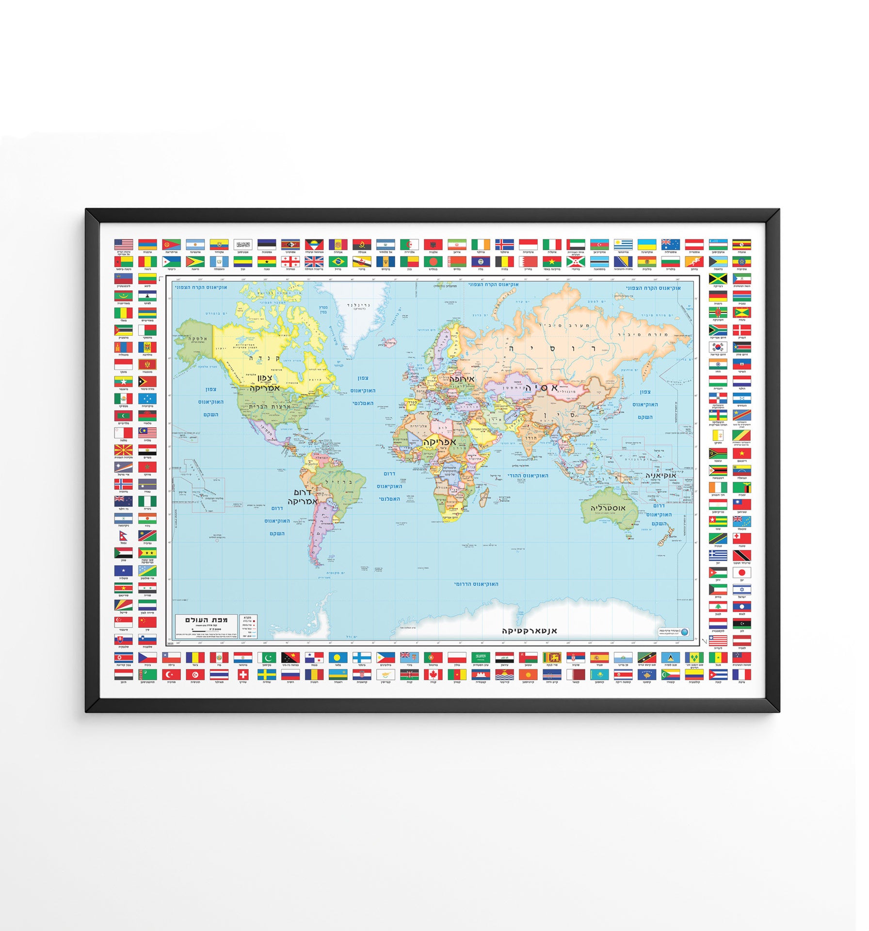 The map indicates all the countries of the world in different colors, including capital cities and other main cities. Around the map are all the flags of the countries of the world. The map projection is a marker, where the lines of longitude and latitude are perpendicular to each other.