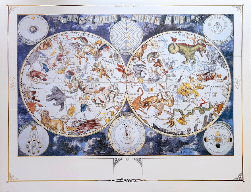 A replica of the zodiac map. The map is surrounded by a gold-colored frame and can be suitable as an impressive gift for the office, living room and collectors.