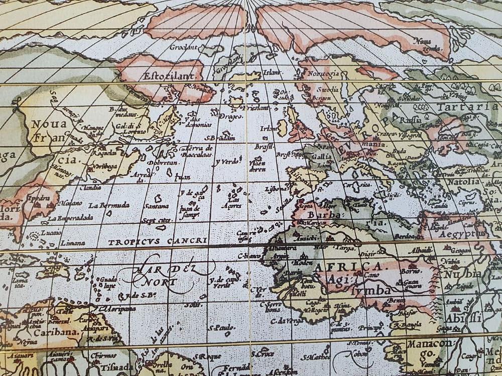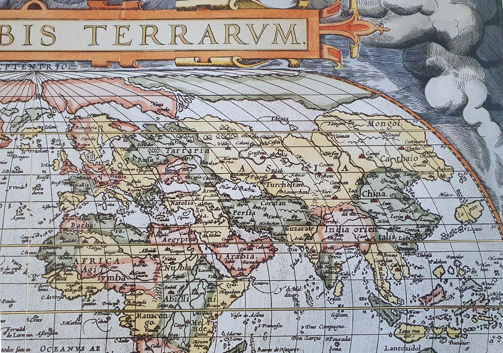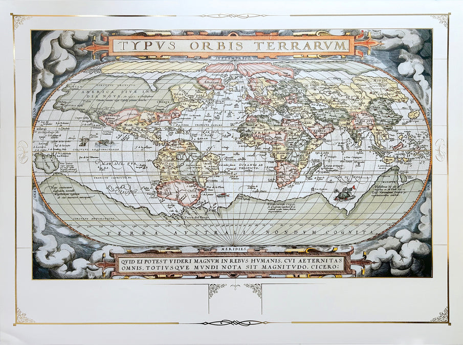 Replica of an ancient world map. The map is surrounded by a gold-colored frame and can be suitable as an impressive gift for the office and the living room.