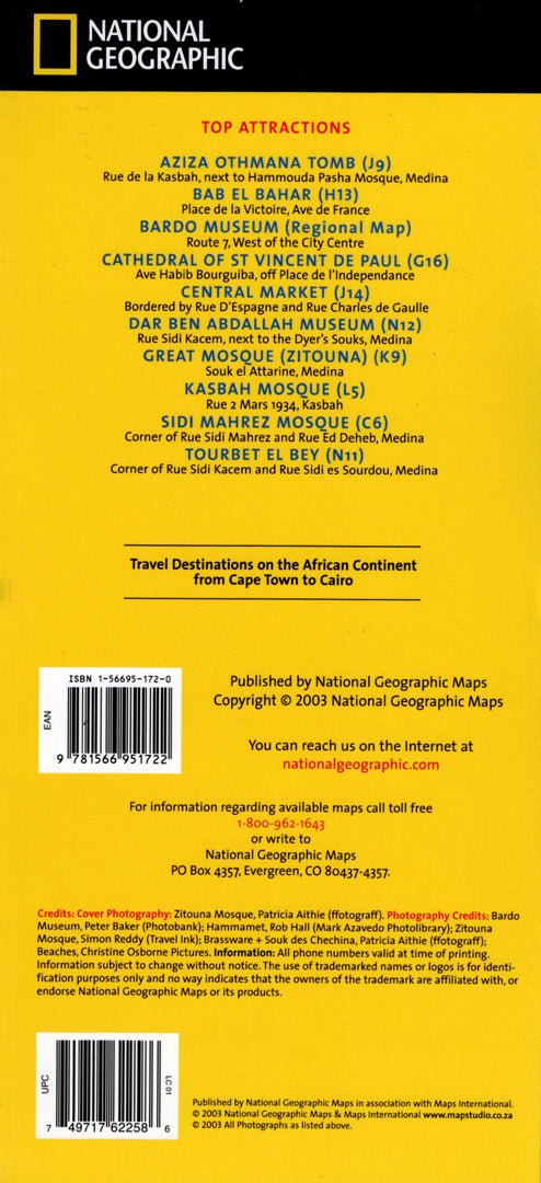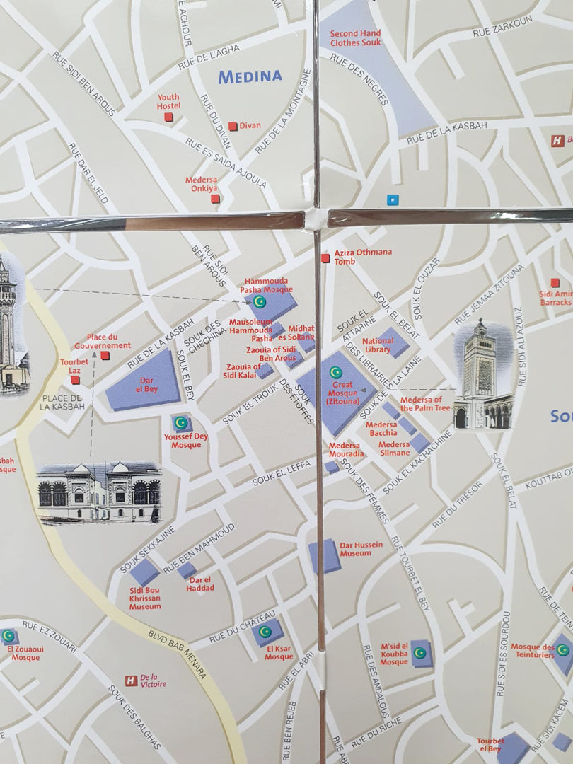 מפת טוניס לתייר העירוני כוללת מידע מפורט על קווי תחבורה כגון אוטובוסים ורכבות, מסלולי הליכה לאורך אתרי התיירות המרכזיים. נקודות עניין ואף מידע תיירותי מחוץ לעיר.המפה כוללת אינדקס רחובות וסימון כל האתרים המרכזיים בצבע בולט. אל תטייל בעיר ללא המפה!