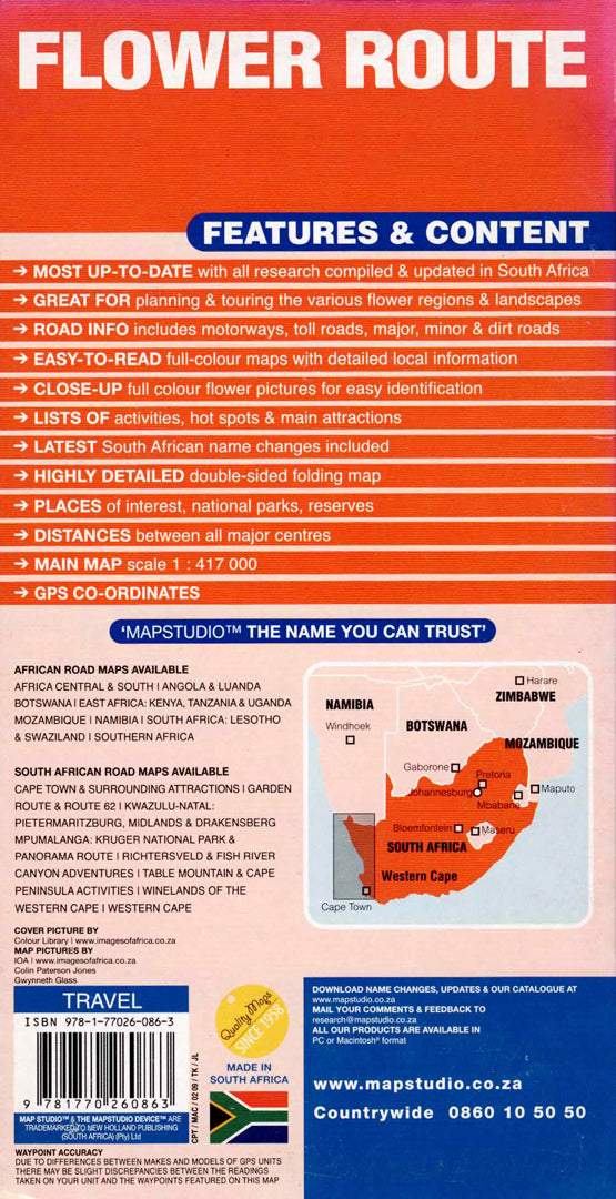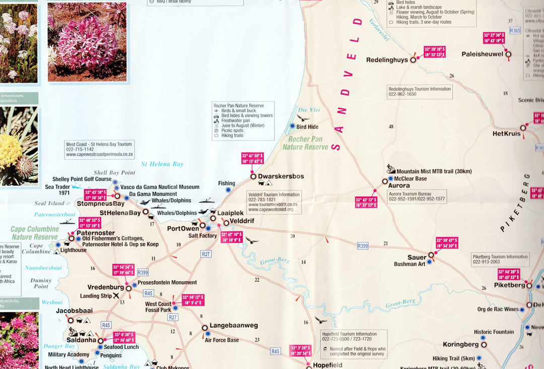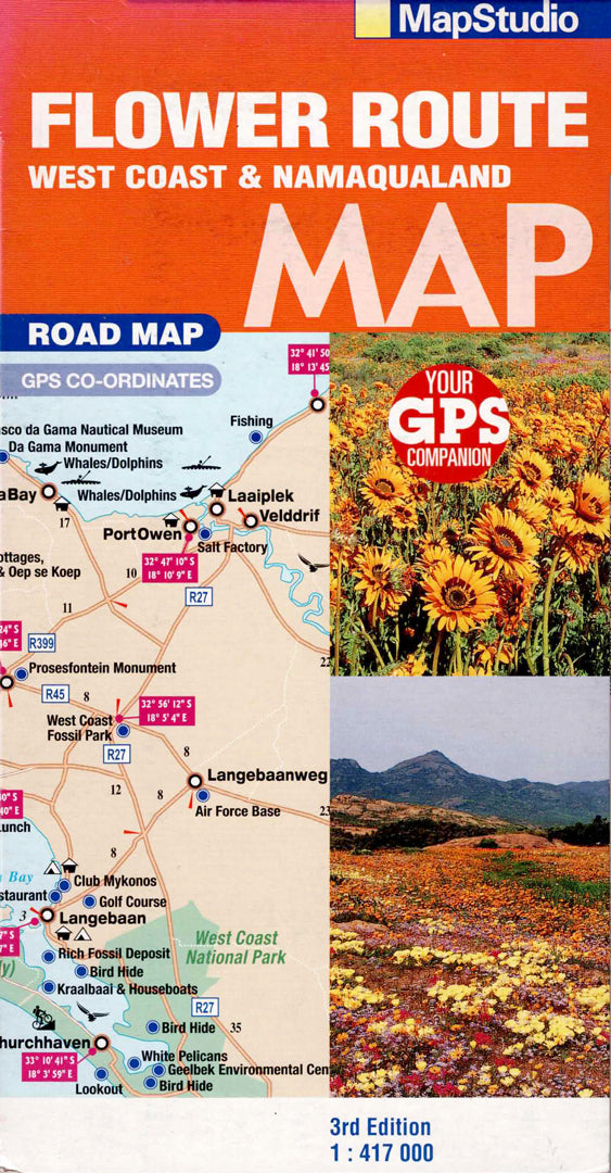 מפת דרכים מפורטת לחקר חוף מערב דרום אפריקה ונמקוואלנד. כוללת נקודות עניין, פארקים לאומיים ותיאום GPS. אידיאלית לטיולים, חובבי טבע וצפייה בפריחה המרהיבה באזור.