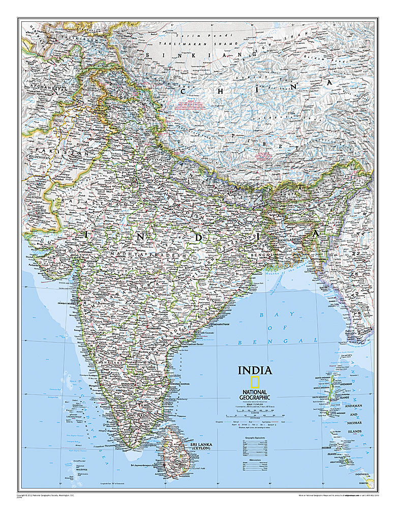 מפת הודו מפורטת באלפי שמות מקומות ומדגישה את הטופוגרפיה של האזור במקומות כמו הרמה הטיבטית וההימלאיה.