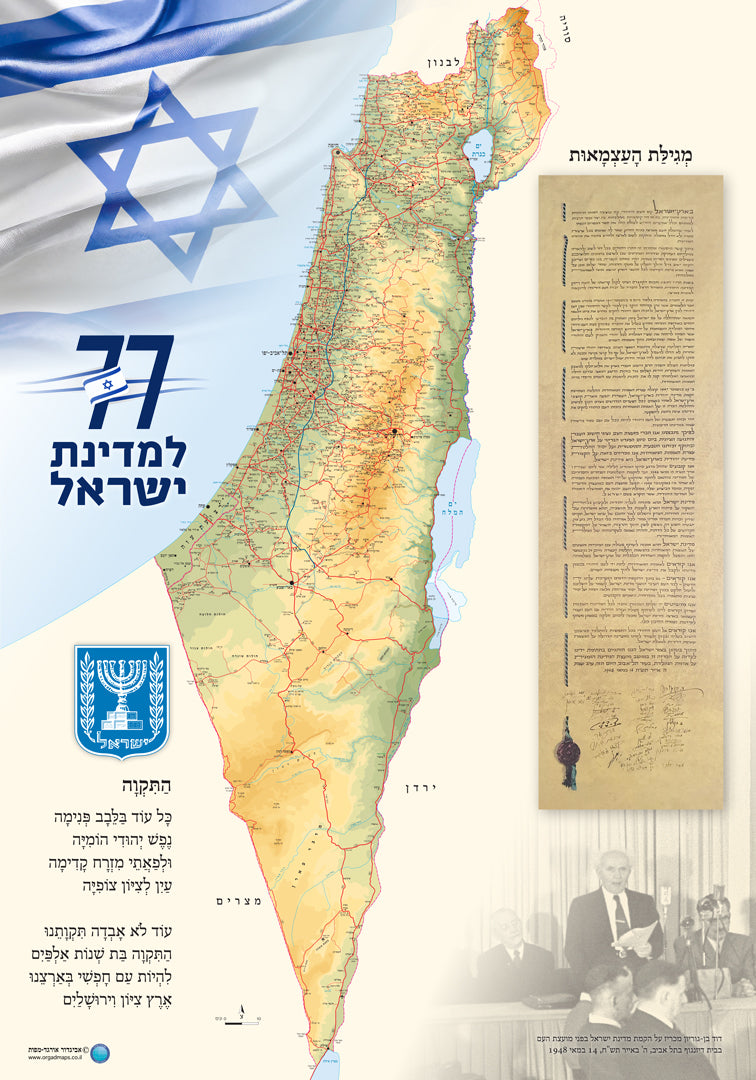 המפה מציגה את סמל המדינה, דגל המדינה, מגילת העצמאות, התקווה והכרזת המדינה של דוד בן גוריון. מתאימה לתלייה בכיתות בבתי ספר, גני ילדים, במשרד העבודה ולכל מי שאוהב את המפה.