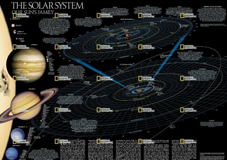מפת מערכת השמש דו צדדית, כך שבצד אחד תיאור של איך מערכת השמש נוצרה ובנוסף מפה של המערכת עצמה עם מסלולו של כל כוכב לכת ביחס לשמש. בנוסף ניתן לראות עובדות מעניינות על כוכבי הלכת השונים. בצד השני תמונה מרהיבה של כוכבי הלכת.